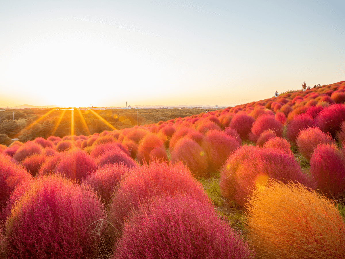 約有46個東京巨蛋的面積,隨季節變化展現不同景色;春天的粉蝶花海,秋天的紅色波波草,一年四季都很迷人。