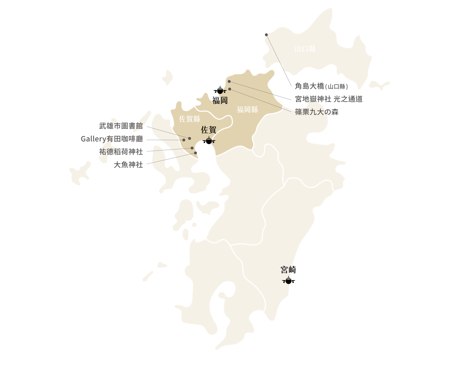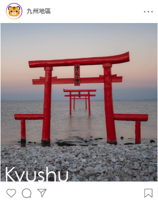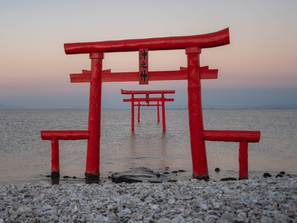 位於佐賀縣太良町,緊鄰有明海,海中三座朱紅鳥居因潮汐變化高達6米而忽隱忽現,成為攝影愛好者的聖地。